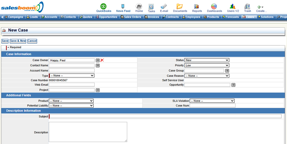 During phone calls or live customer interactions, support agents need speed. The Quick Create Case feature captures essential information in seconds with minimal fields: Case Owner, Contact Name, Account Name, Type, and Subject. This ensures no service request is missed during busy periods while maintaining proper tracking.